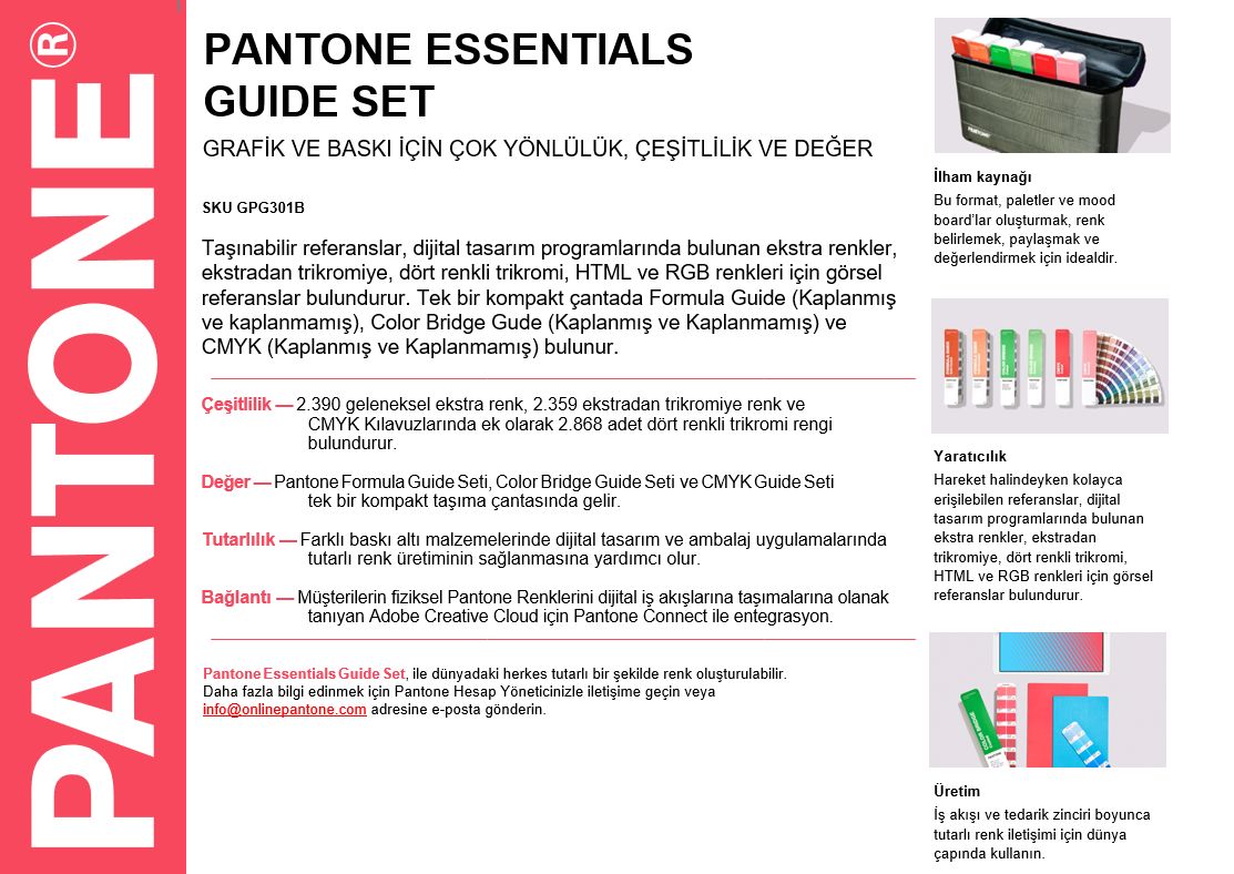 294 yeni renk eklendi! Essentials Guide Set size kompakt bir taşıma çantası içerisinde altı temel Pantone Grafik Kartelası sunar. Tasarımcılar ve tasarım öğrencileri olarak her iki grup için de rengin ilhamından iletişimi,doğrulanması ve spot renklerin CMYK,HTML veya RGB’ye tercümesi için faydalıdır.