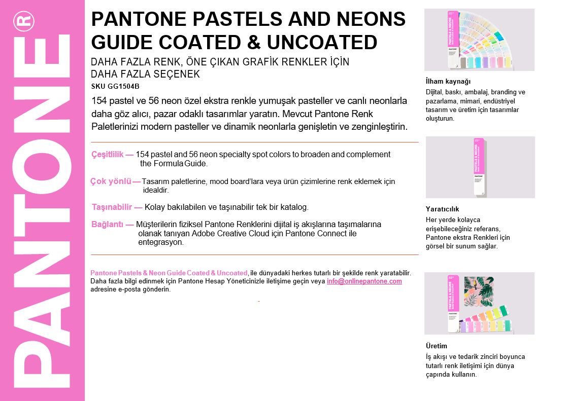 Pantone Pastel&Neon Kartela ile 200’den fazla pastel ve neon renk ile geleneksel spot renk paletinizi genişletin .Yatıştırıcı tonlar veya parlak renkler istendiğinde, ambalaj logoları ve marka oluşturma ve baskı /pazarlama malzemeleri için mükemmeldir.
